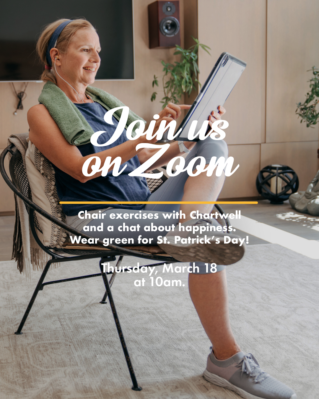 Join your hosts Sarah and Angela, and guest Aussa from Chartwell Rogers Cove. She will lead us through seated chair exercises, for our monthly fitness fun! Wear green in honour of St. Patrick’s Day! Then, stick around for a discussion about happiness, to celebrate International Day of Happiness on March 20th!! 🌞